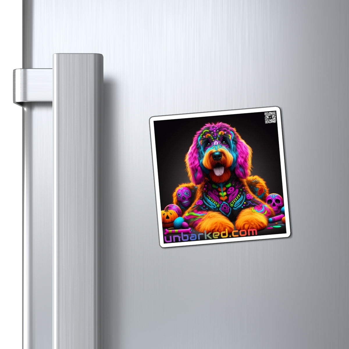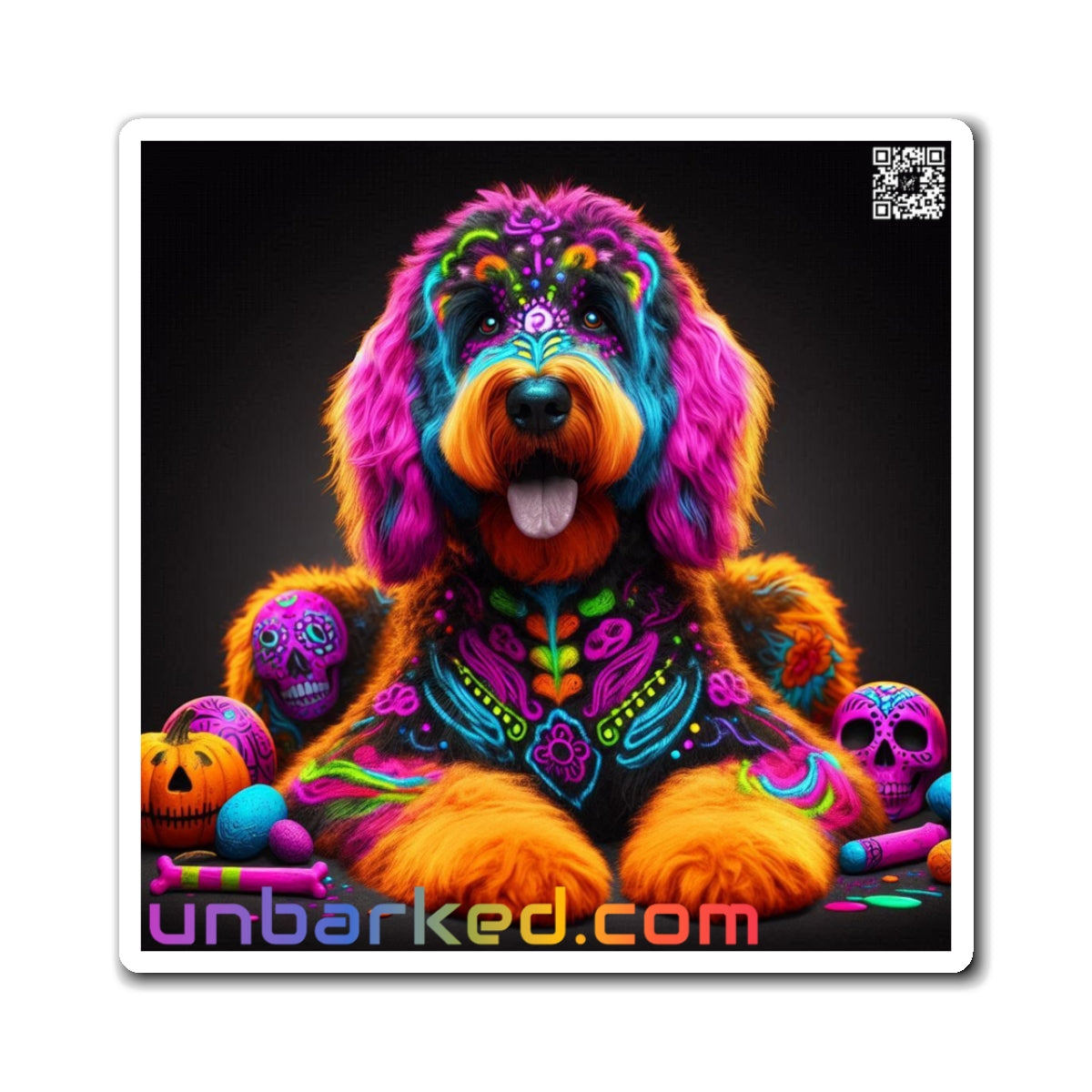 3" Square Magnet - UNBARKED! Halloween Collection - Bernadoodle Doodle Dog Vibrant Día de Muertos Tattoo