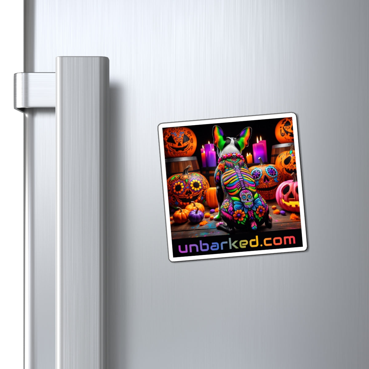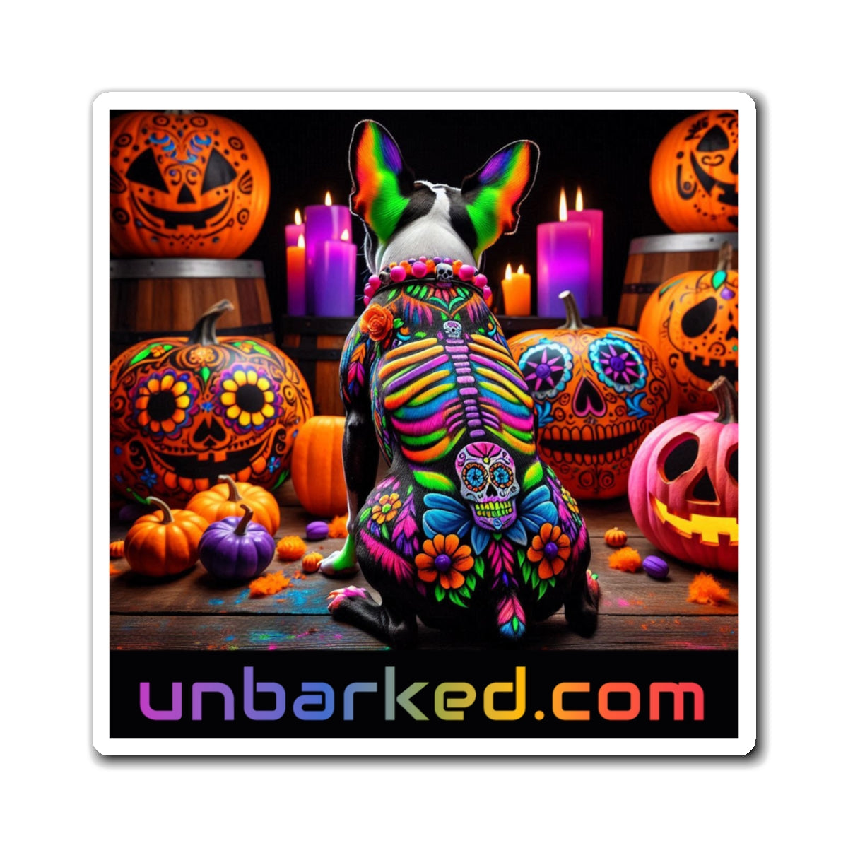 3" Square Magnet - UNBARKED! Halloween Collection - Boston Terrier Dog Vibrant Día de Muertos Tattoo