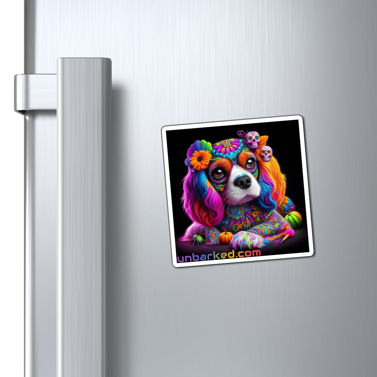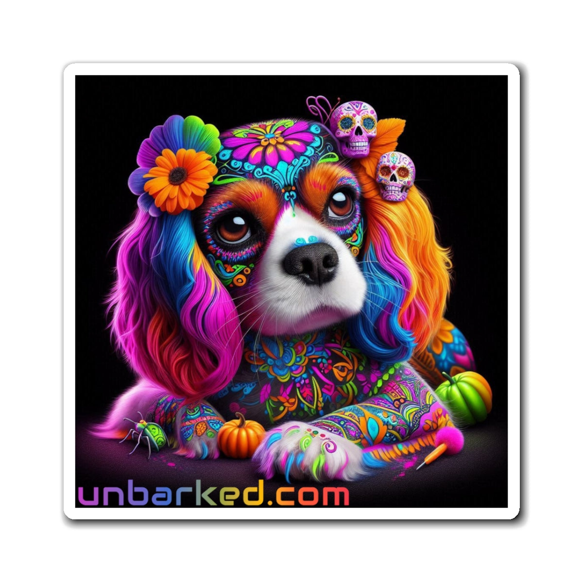3" Square Magnet - UNBARKED! Halloween Collection - Cavalier King Charles Spaniel Dog Vibrant Día de Muertos Tattoo