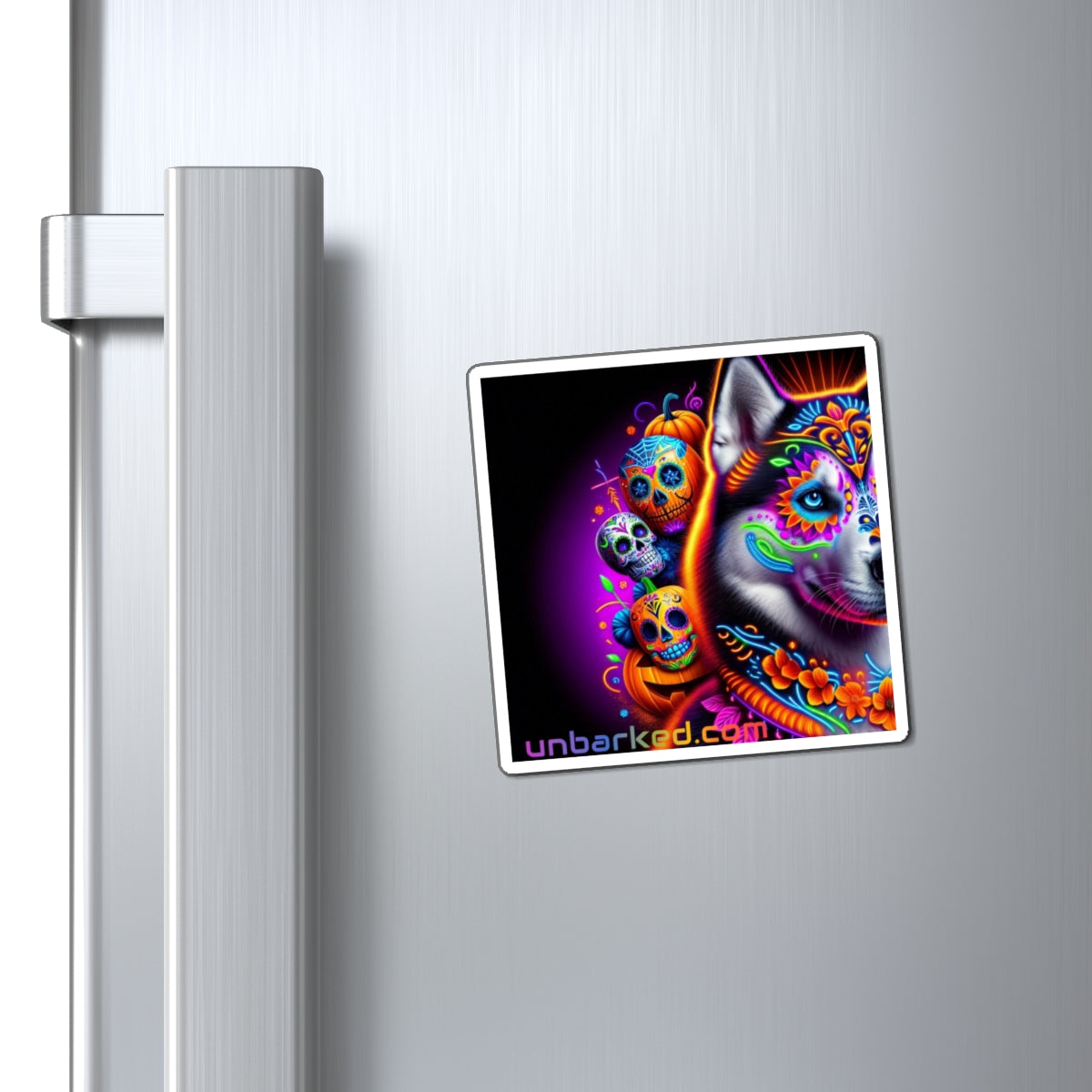 3" Square Magnet - UNBARKED! Halloween Collection - Husky Alaskan Malamute Dog Vibrant Día de Muertos Tattoo