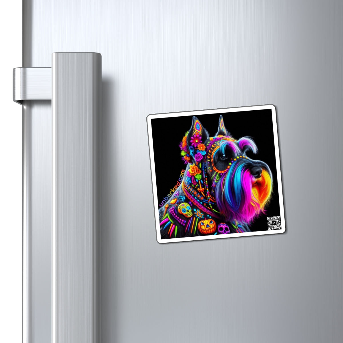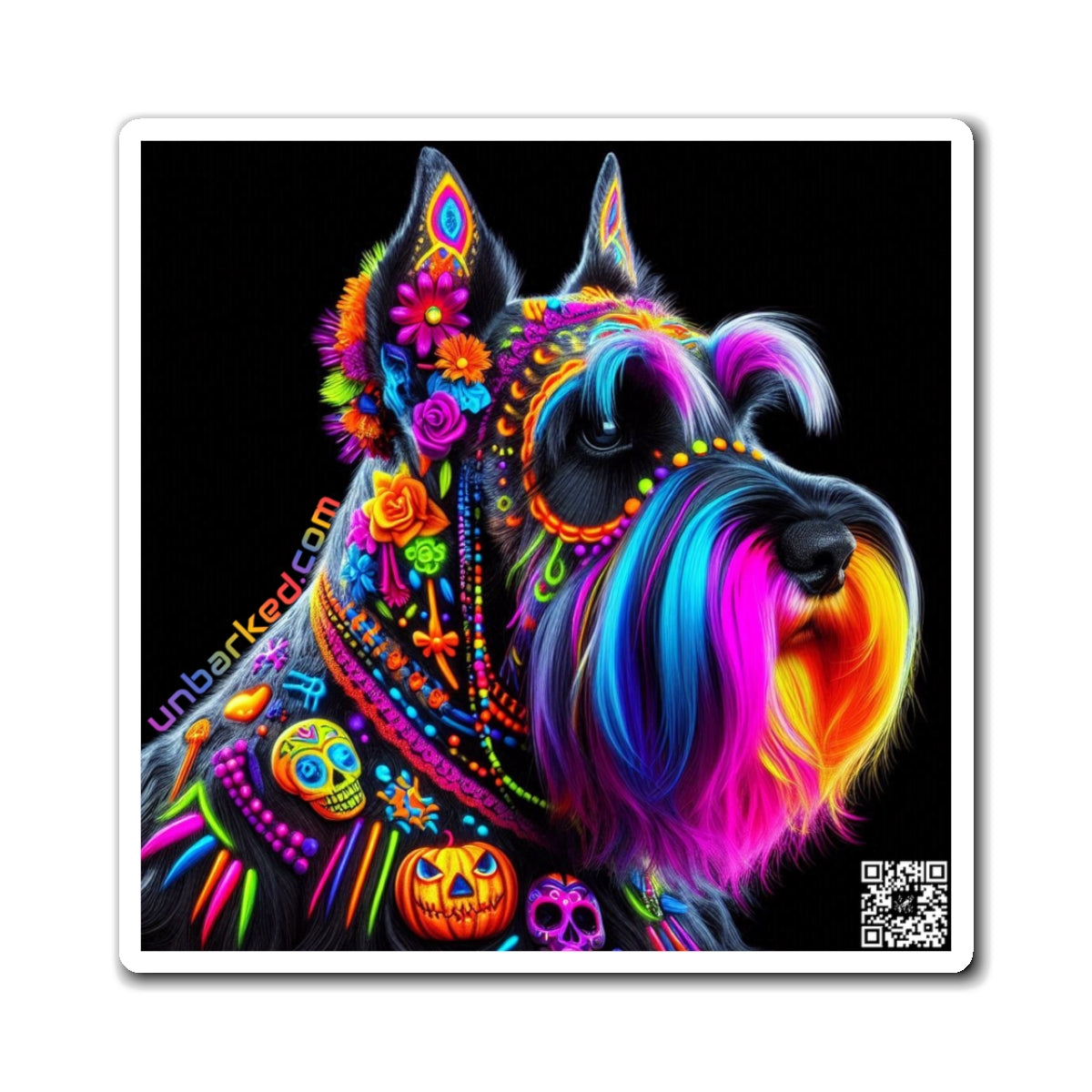 3" Square Magnet - UNBARKED! Halloween Collection - Schnauzer Dog Vibrant Día de Muertos Tattoo