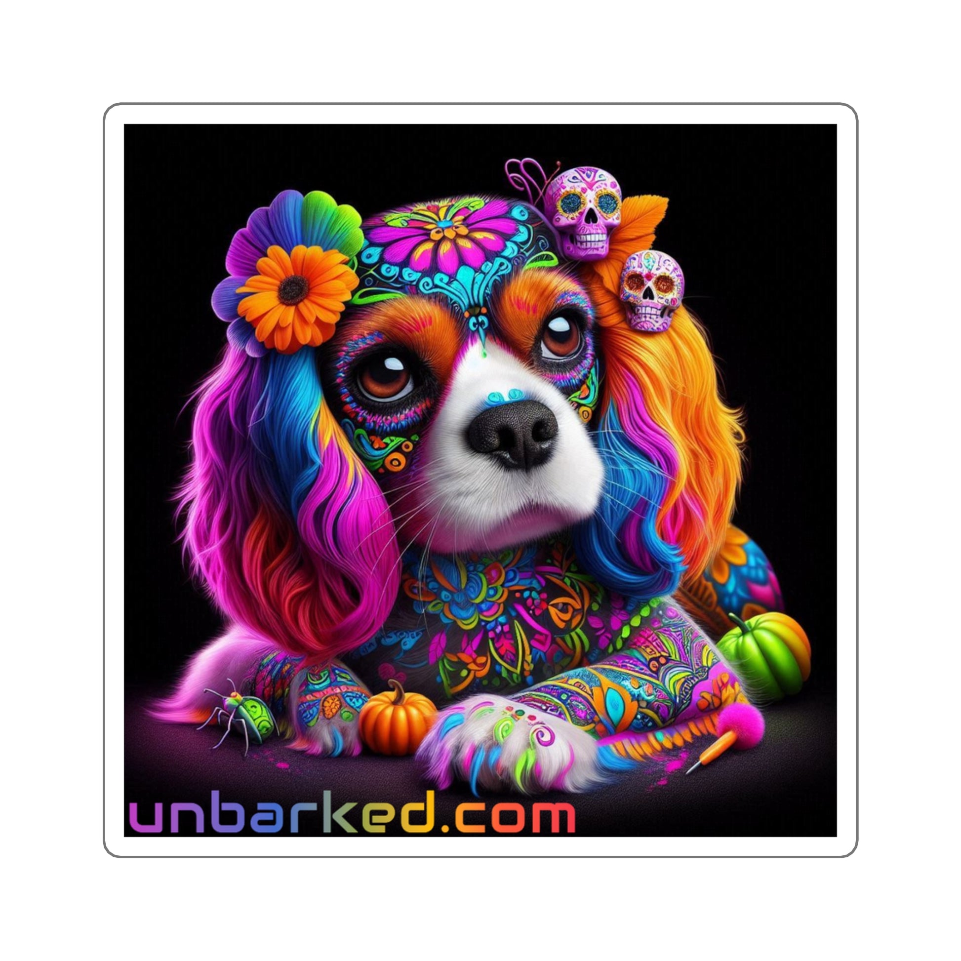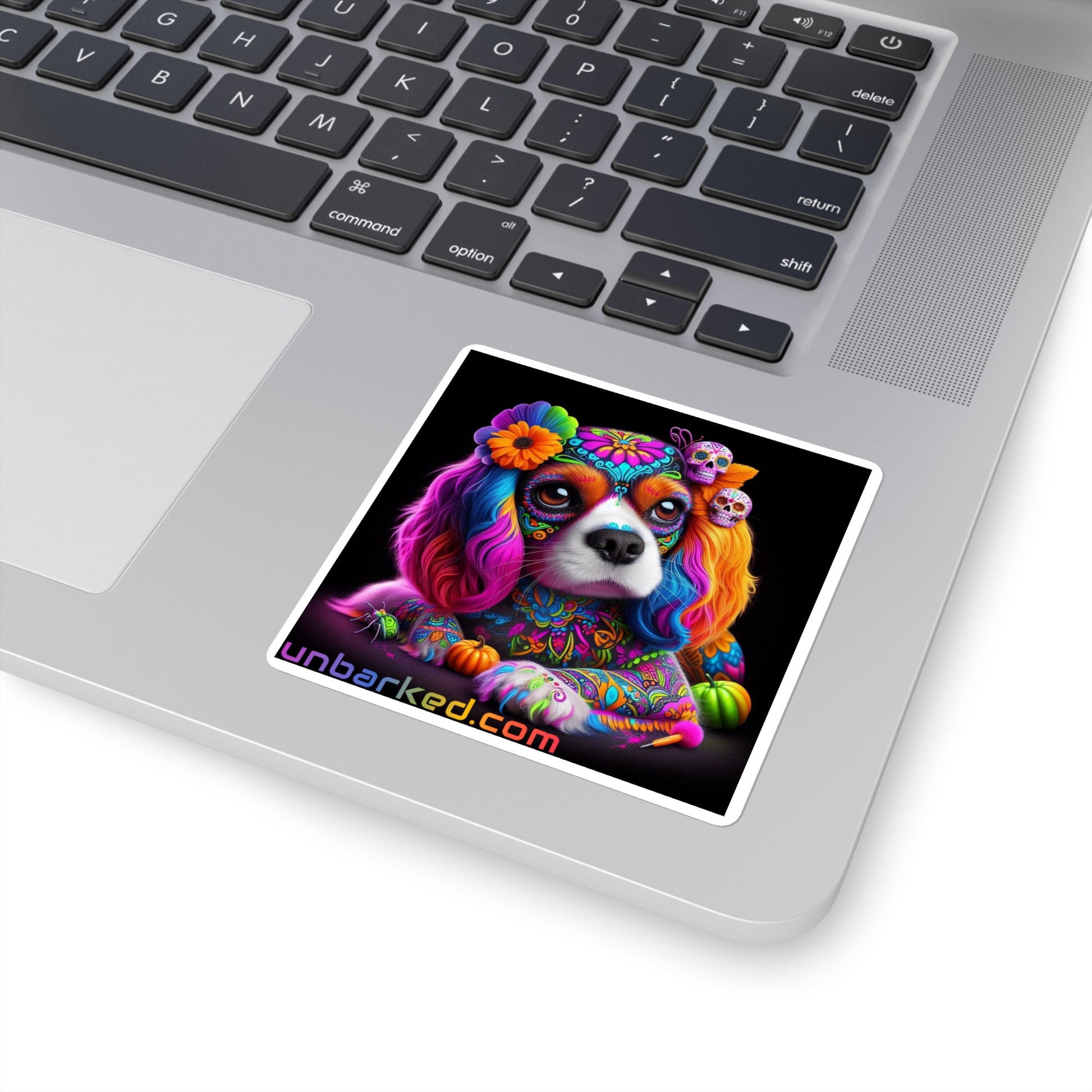 3x3" Square Sticker UNBARKED! Halloween Collection - Cavalier King Charles Spaniel Dog Vibrant Día de Muertos Tattoo