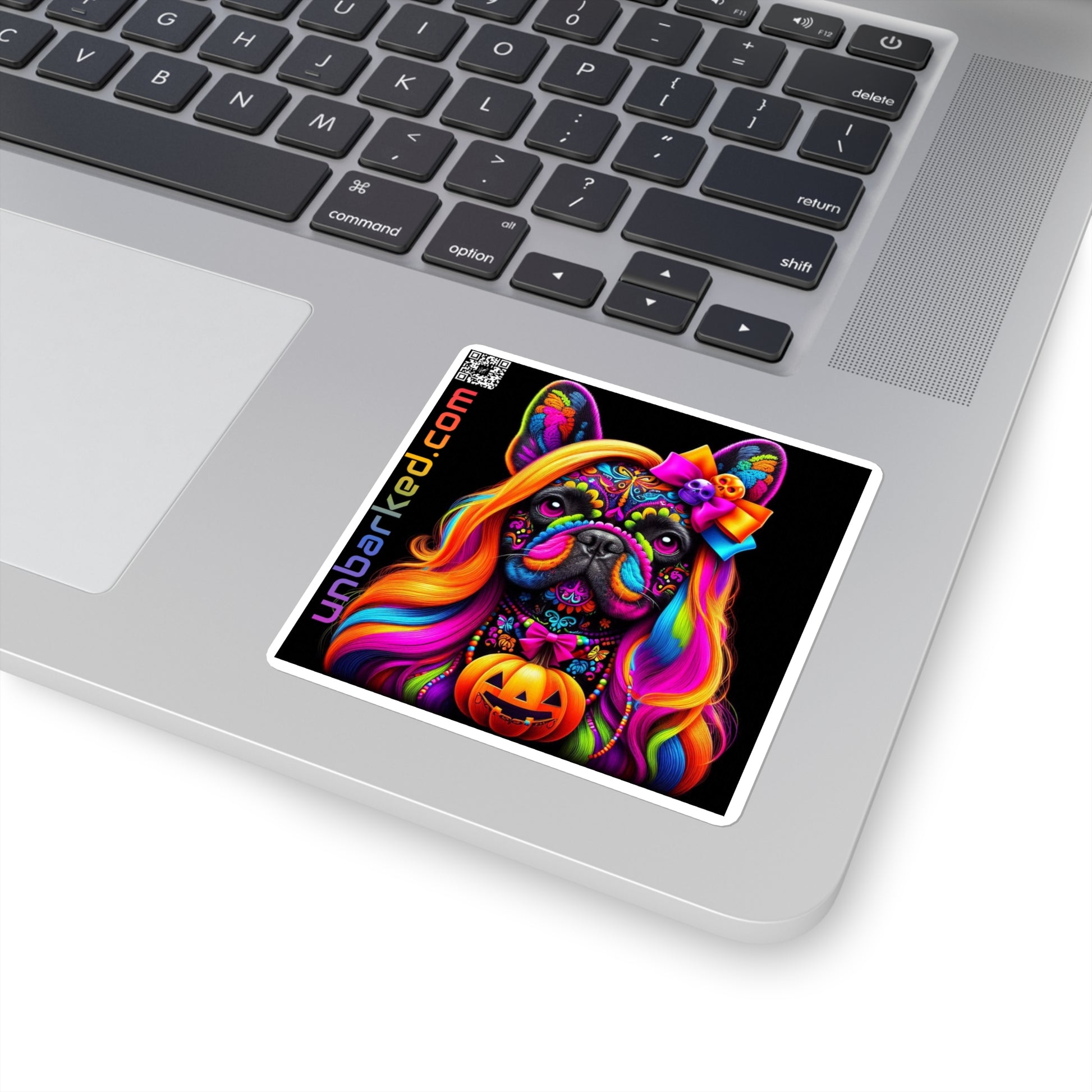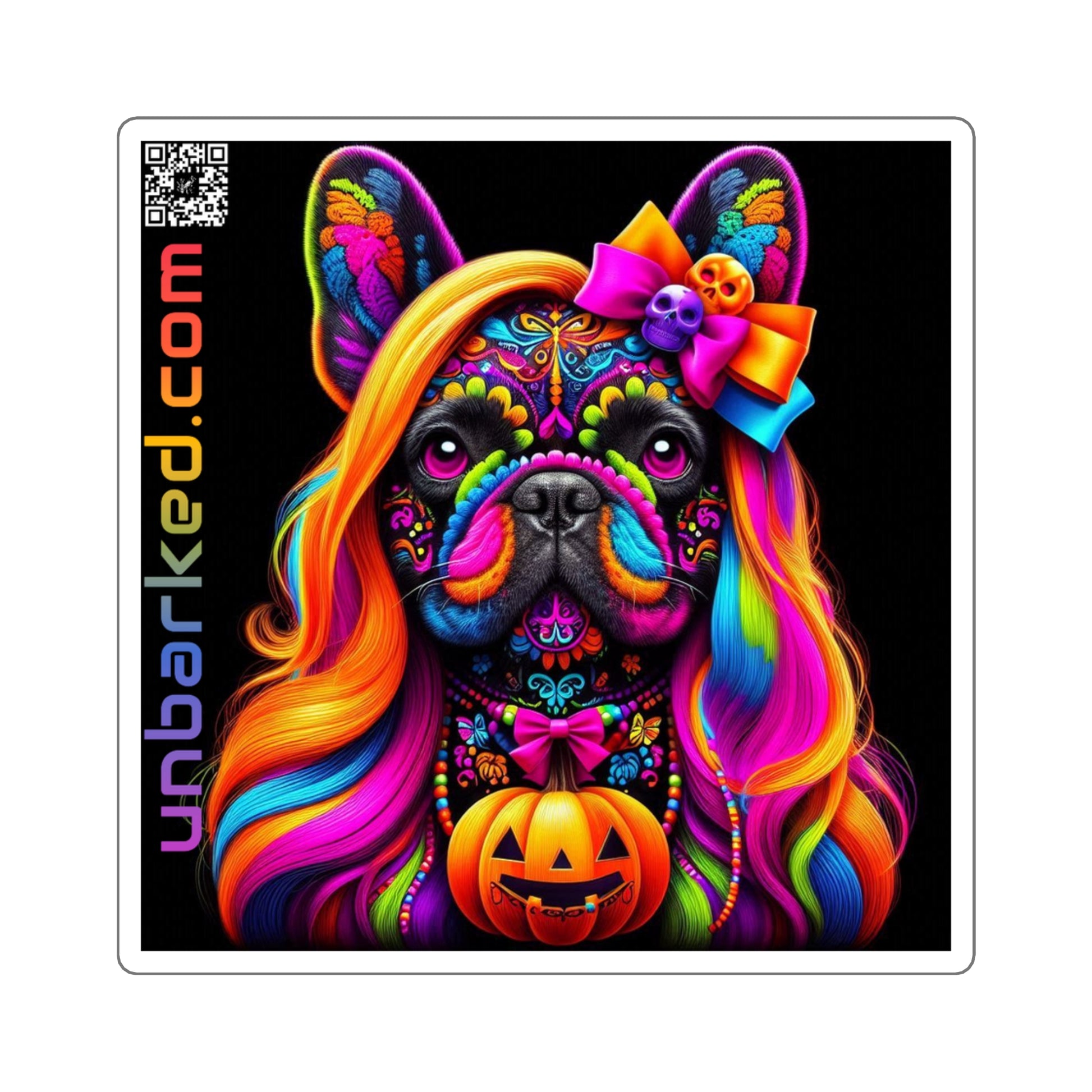 3x3" Square Sticker UNBARKED! Halloween Collection - Frenchie Dog Vibrant Día de Muertos Tattoo