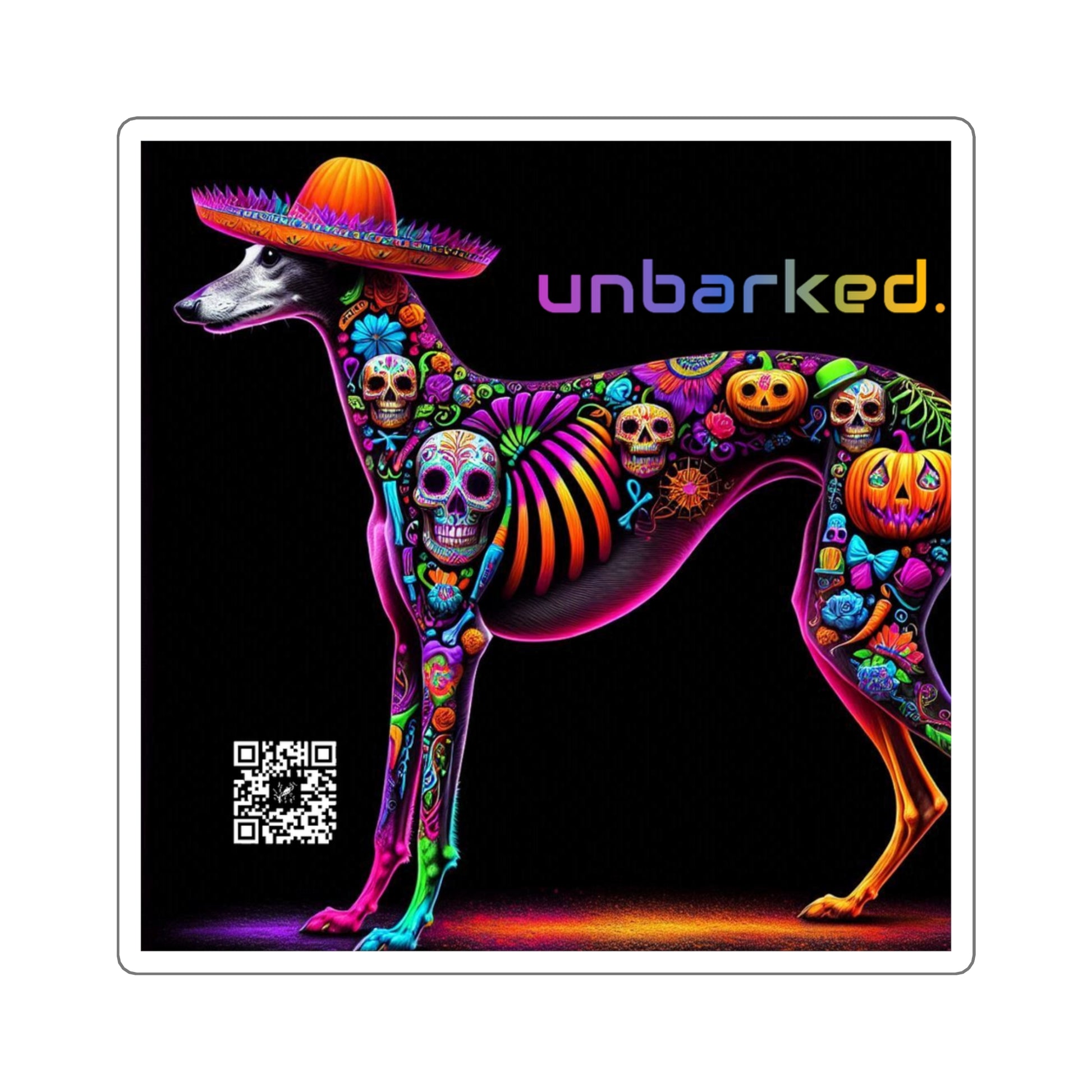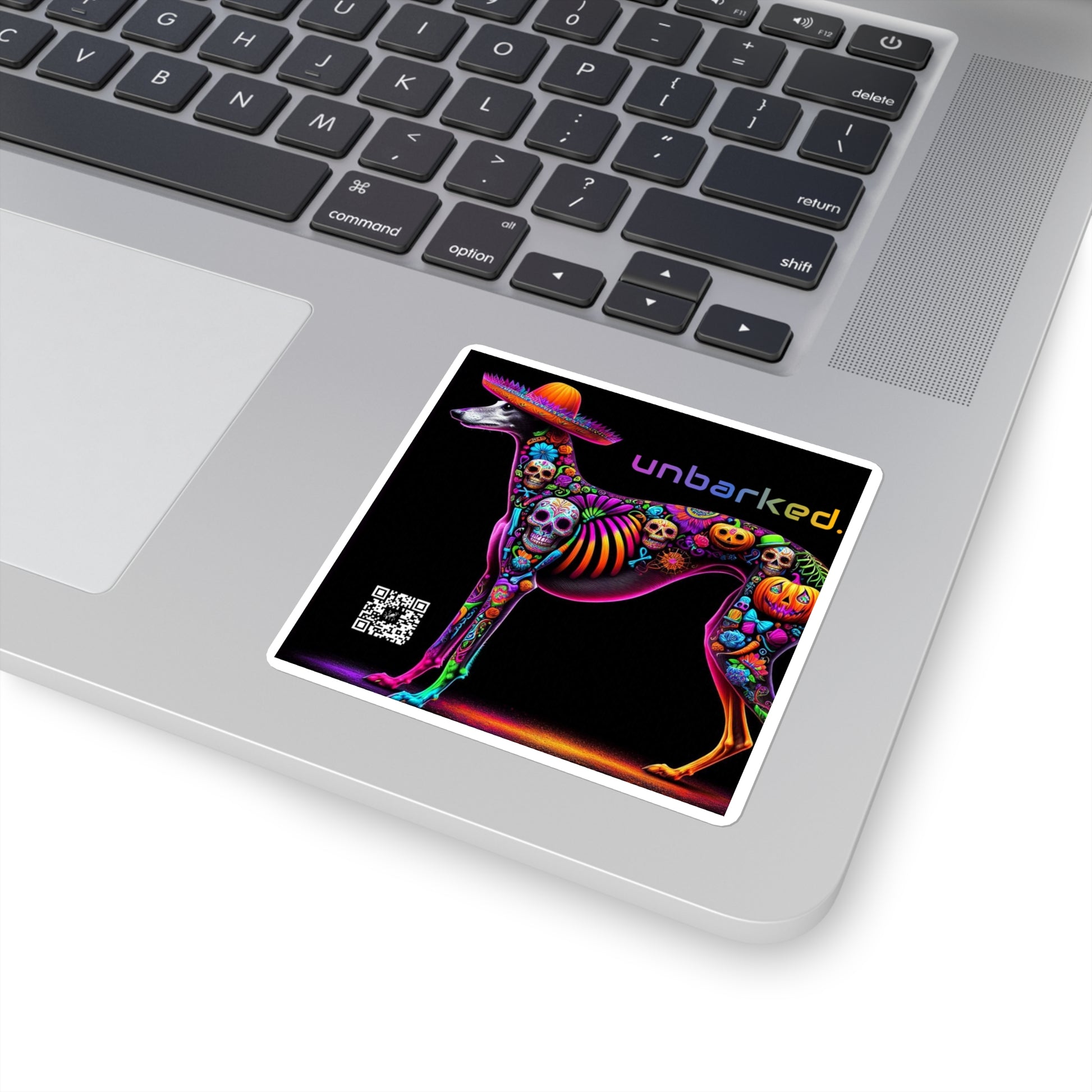 3x3" Square Sticker UNBARKED! Halloween Collection - Galgo Greyhound Dog Vibrant Día de Muertos Tattoo